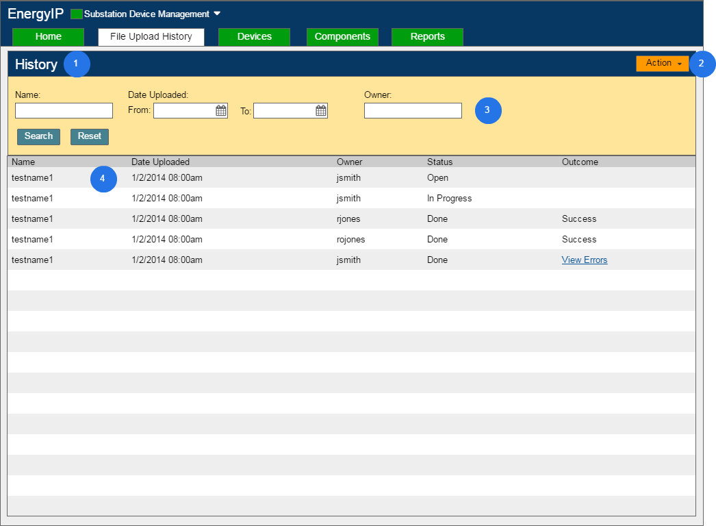 This file upload screen is how Customer Kate would upload information about her substation devices to our software. Here she can see all of the files that have been uploaded previously and if those uploads have been successful or not. The importance of putting down whether they have successfully uploaded because these are XML files and so there is room for a lot of error. In cases where many files have been uploaded, we have the search section so Kate would have an easier time finding a specific file.