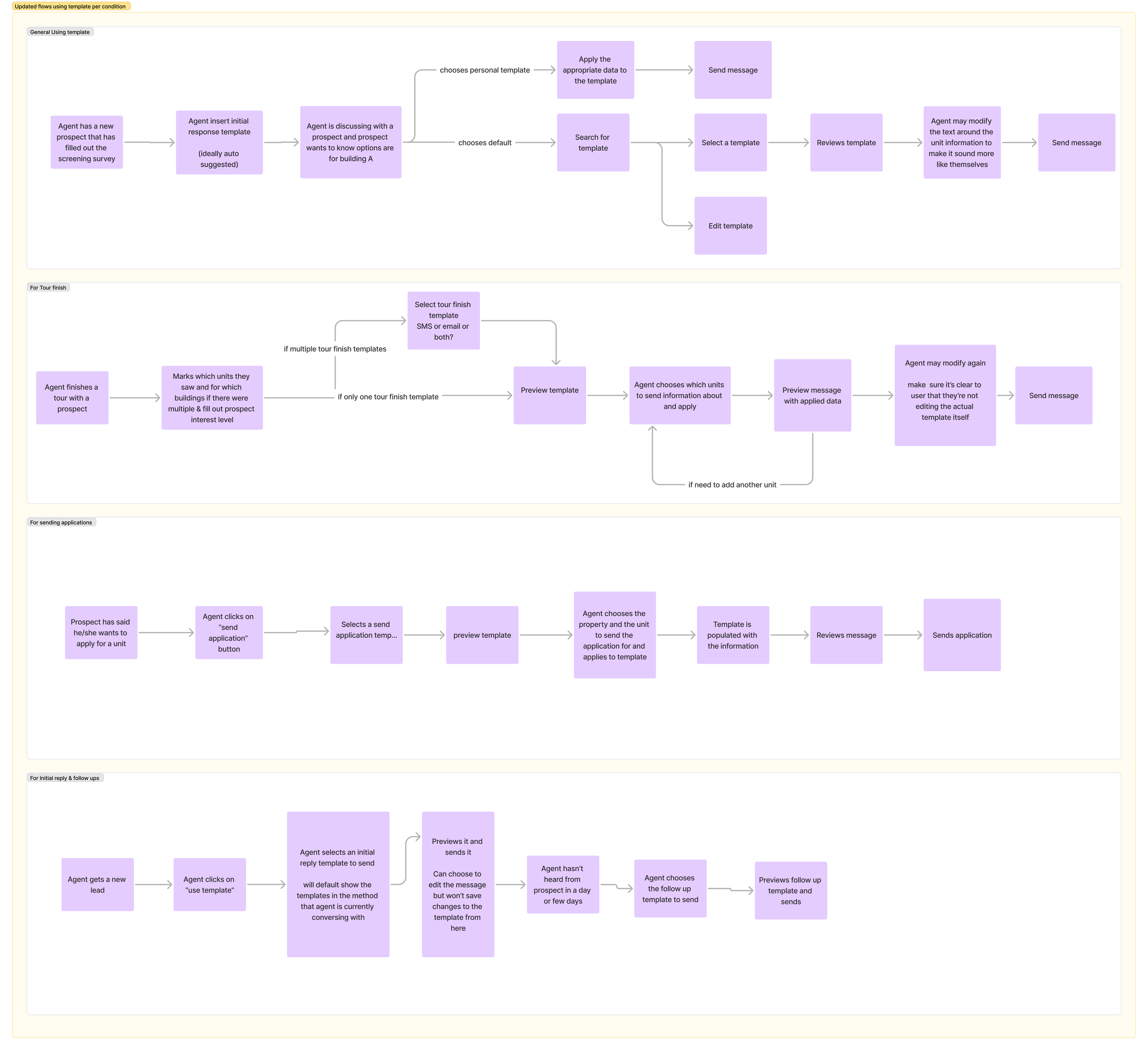 Separated the flows into the 4 main use cases in the product that would use templates: general usage, completing a tour finish flow, sending applications, and for initial replies and follow ups with prospects.
