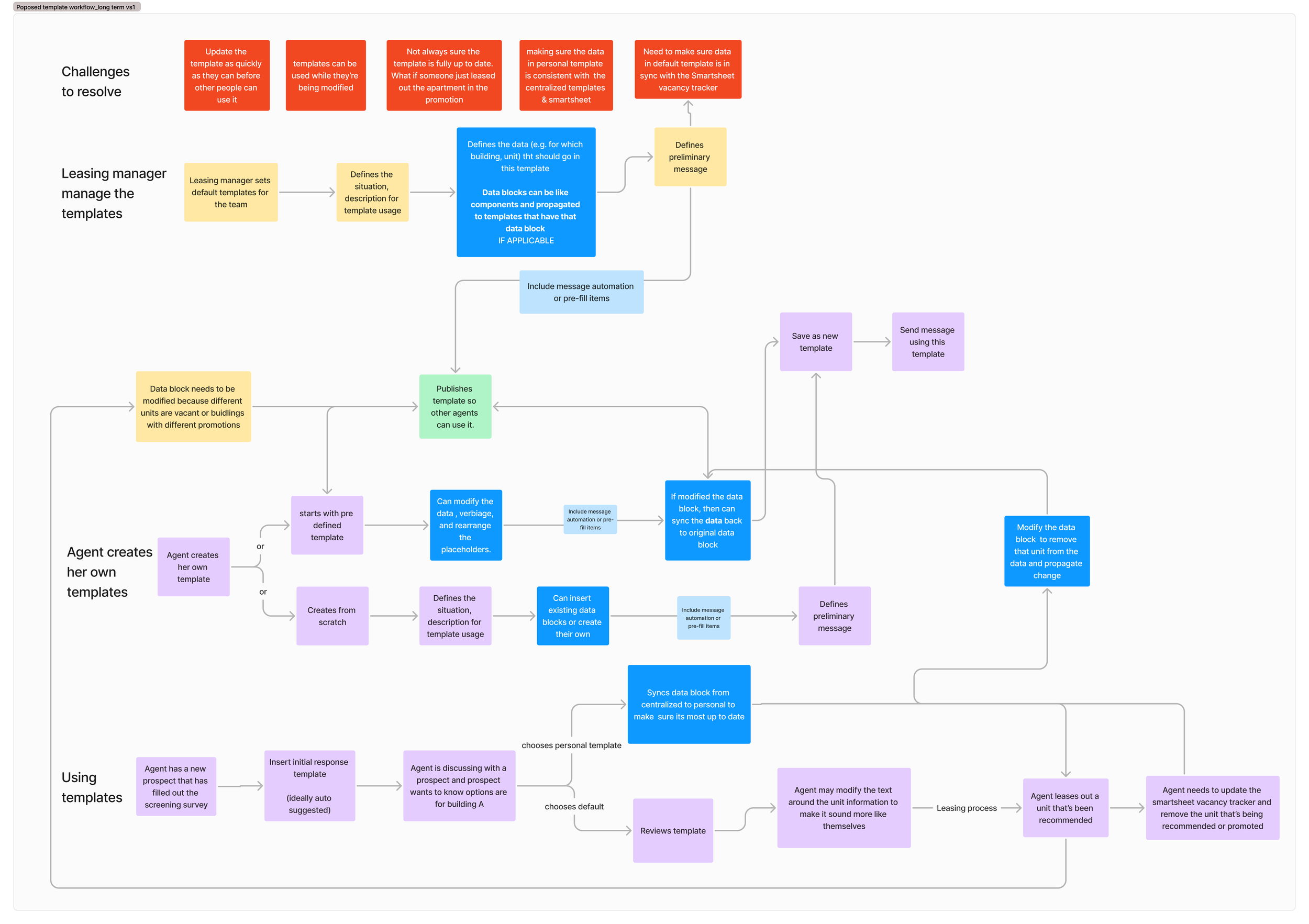 Created and validated vision for how this feature would work in the existing Renty product with the product team and operations team. The overall vision includes how leasing managers would create templates for their employees, how leasing agents can create templates for themselves, and how each person would use the template to communicate with prospects.